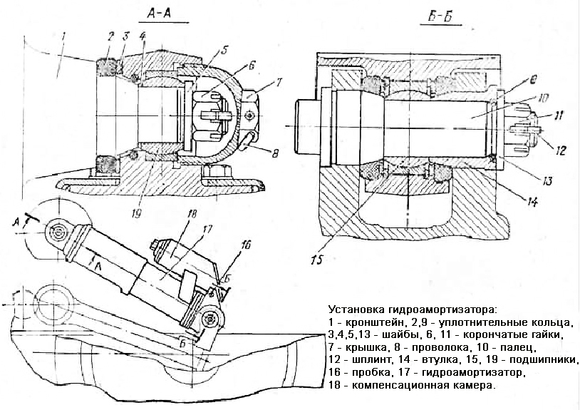 Гидроамортизатор 17 установите проушиной штока на кронштейн 1 таким образом, чтобы камера 18 компенсационная находилась вверху. Если необходимо, отверните болт, который служит для крепления кожуха гидроамортизатора к проушине штока, поверните его таким образом, чтобы вырез овальный в кожухе был направлен в сторону рычага катка опорного. Затем зафиксируйте болтами кожух гидроамортизатора.