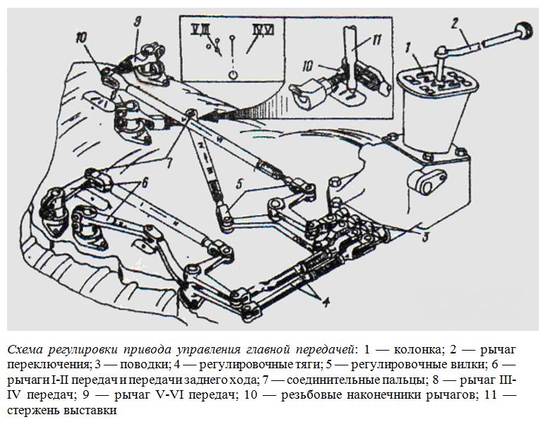 Работы по регулировке привода управления основной передачей должен проводить высококвалифицированный специалист. При этом используются гаечные ключи 24 мм и 19 мм, стержень выставки поводков и рычагов, плоскогубцы.