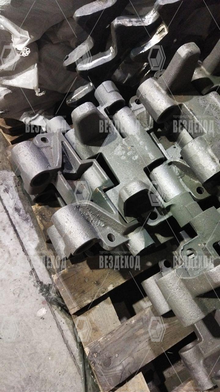 8.34.011 - Звено гусеницы РМШ в сборе представляет собой сложное профилированное изделие, на внутренней стороне которого расположены два ребра. С наружной стороны имеются зацепы в форме шевронов, которые обеспечивают сцепление гусеницы с грунтом. В передней и задней частях звена находятся проушины, которые служат для соединения звеньев в непрерывную ленту; каждая из проушин содержит отверстие для установки пальца — спереди их два, а сзади — три. Данное звено изготавливается из прочной и коррозионно-стойкой стали методом штамповки, что обеспечивает его надежность и долговечность.