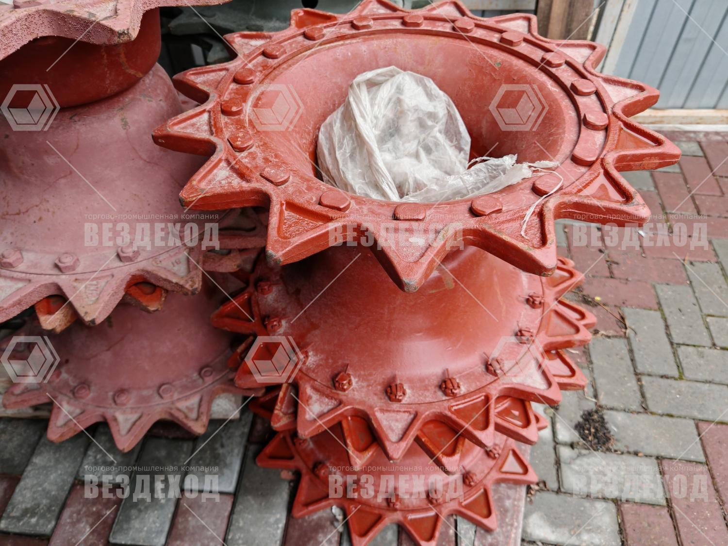 8.30.001 – Ведущее колесо в сборе является компонентом гусеничного движителя вездехода, относится к цевочному типу. Ведущее колесо состоит из двух зубчатых венцов и расположенной между ними ступицы. Основные элементы установки – зубцы венца, которые входят в пазы трака и упираются в его стенки, называемые цевками. Колесо выполняет перемотку гусеничной ленты и преобразует своё вращательное движение в поступательное движение транспортного средства.